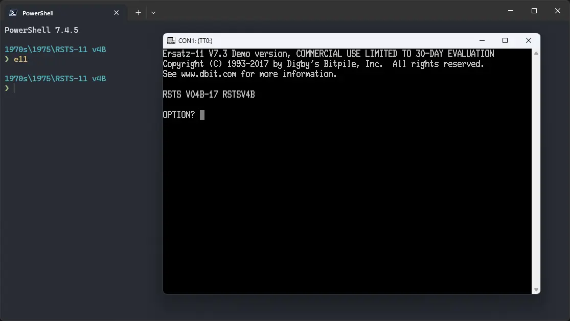 This tutorial covers how to use ! RSTS-11 v4B on Ersatz-11 emulator using a pre-installed image. If you want to manually install RSTS-11 v4B from its tape image, visit this page. That page covers installing it on SIMH, and not Ersatz-11, though.
