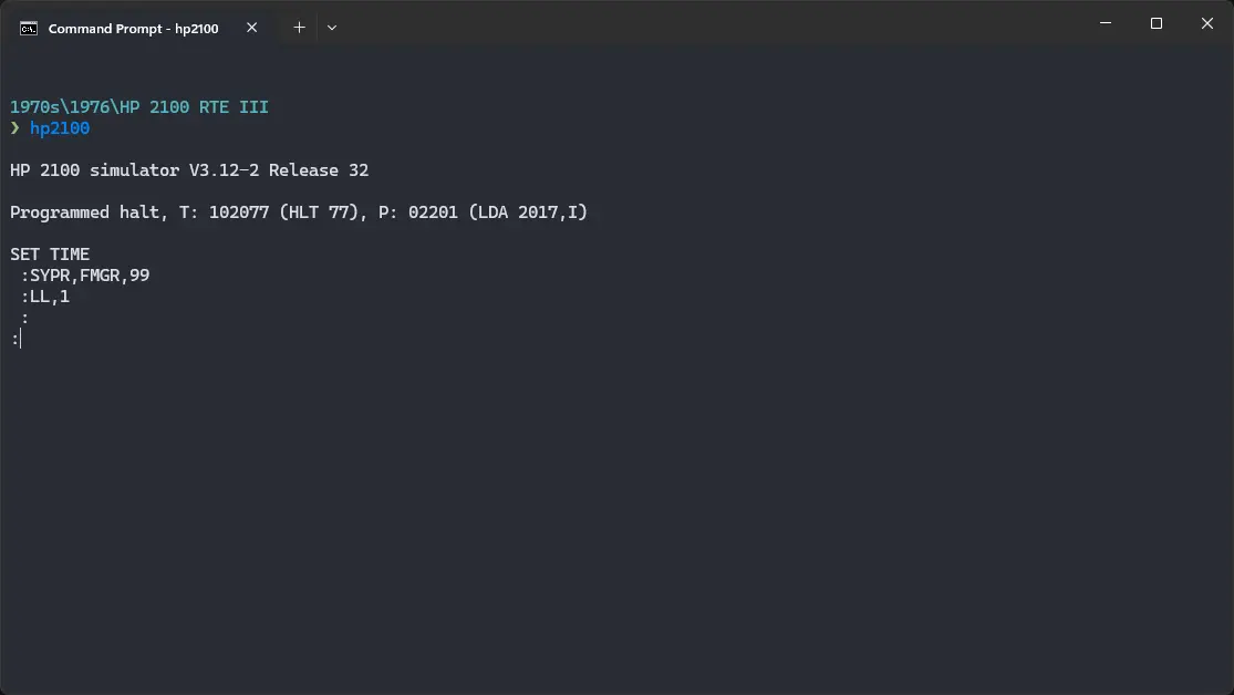Now you can start the VM by double-clicking the shell script. See the manuals section on the main ! HP 2100 RTE-III page to learn how to use it.
